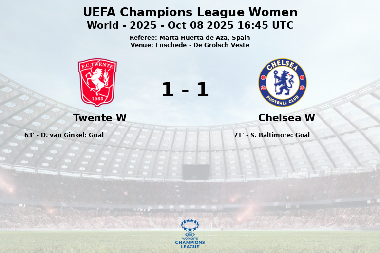 Num jogo disputado no estádio De Grolsch Veste em Enschede, Twente e Chelsea empataram com um resultado final de um a um na jornada inaugural da Liga dos Campeões Feminina da UEFA. O Chelsea, dominando a posse de bola com 64% contra 36% do Twente, não conseguiu converter sua superioridade em gols.