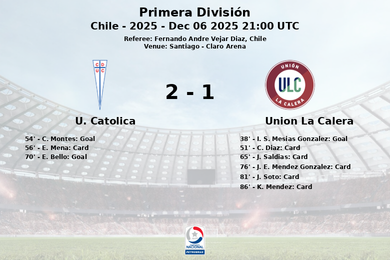 O Unión La Calera surpreendeu aos 38 minutos com um gol de I. S. Mesias Gonzalez, assistido por J. E. Mendez Gonzalez, colocando os visitantes em vantagem. No entanto, a reação do U. Católica não demorou. Aos 54 minutos, C. Montes, com assistência de E. Bello, igualou o placar. A virada se concretizou aos 70 minutos, com um gol de E. Bello, assistido por J. Valencia, selando a vitória para a equipe da casa.