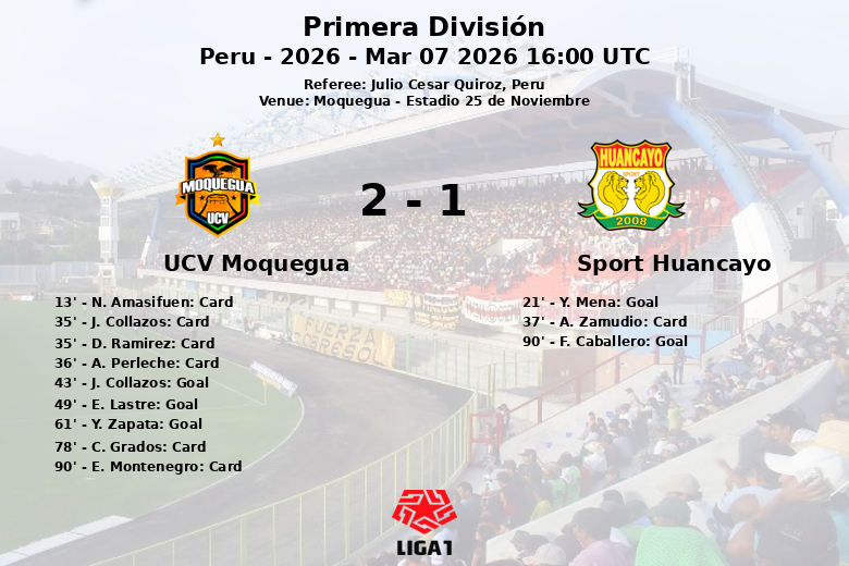 Substituiões na equipe de ucv moquegua: Aos 30 minutos, K. Ruiz entrou e E. Lastre saiu., Aos 46 minutos, D. Ramirez entrou e N. Chavez saiu., Aos 73 minutos, A. Davila entrou e C. Ramirez saiu., Aos 84 minutos, A. Perleche entrou e E. Montenegro saiu., Aos 84 minutos, J. Collazos entrou e Bryan Angulo saiu.