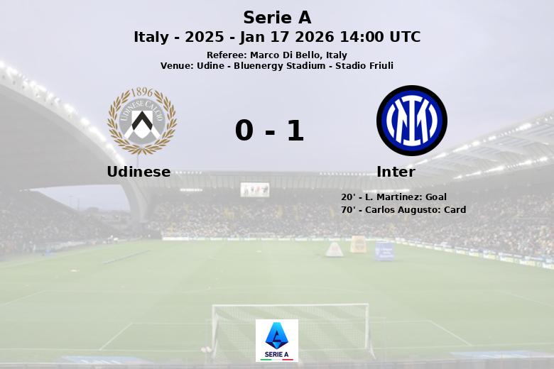Udine, Itália – A Inter de Milão derrotou a Udinese no Bluenergy Stadium – Stadio Friuli em partida válida pela 21ª rodada da Serie A. A partida, disputada em 17 de janeiro de 2026, viu a Inter dominar a posse de bola com 63% contra 37% da Udinese.
