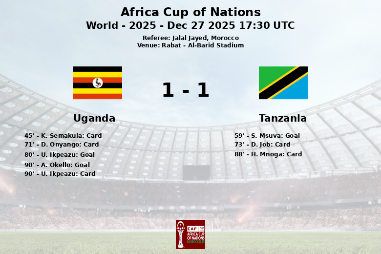 Rabat, 27 de dezembro de 2025 – Uma partida de alta intensidade e reviravoltas no Estádio Al-Barid terminou em empate entre Uganda e Tanzânia. O jogo, parte da fase de grupos da Copa Africana de Nações, certamente não decepcionou.