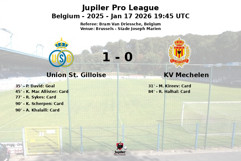 Bruxelas, Bélgica – O Union St. Gilloise derrotou o KV Mechelen num jogo disputado no Stade Joseph Marien, correspondente à jornada 21 da Jupiler Pro League. O único golo da partida surgiu aos 35 minutos, marcado por P. David, com assistência de K. Van De Perre, dando a vantagem decisiva à equipa da casa.