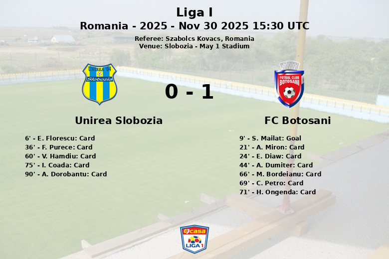 O gol de S. Mailat aos 9 minutos, com assistência de M. Pavlovic, deu a vantagem ao FC Botoșani, que soube administrar sua vantagem apesar da pressão exercida pelo Unirea Slobozia.