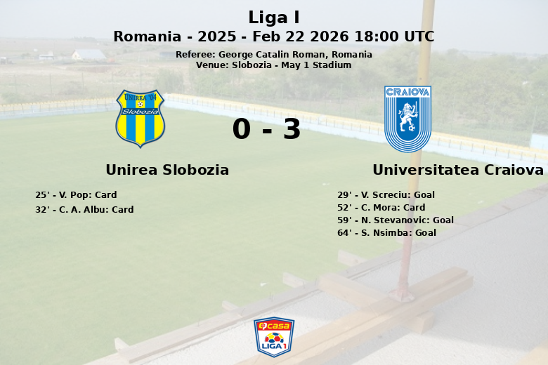 Slobozia, Romênia – Em uma partida realizada no May 1 Stadium, o Universitatea Craiova derrotou decisivamente o Unirea Slobozia, demonstrando superioridade tanto na posse de bola quanto na eficácia em marcar gols. A partida, válida pela 28ª rodada da temporada regular da Liga I, culminou em uma clara vitória para os visitantes.