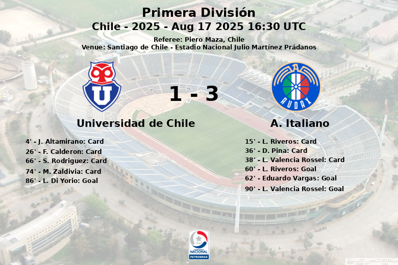 Embora a Universidad de Chile tenha dominado a posse de bola com 69%, a efetividade do Audax Italiano na baliza contrária foi determinante. A equipe visitante aproveitou as oportunidades, marcando três gols que silenciaram a torcida local. Os gols do Audax Italiano foram marcados por L. Riveros (minuto 60), Eduardo Vargas (minuto 62) e L. Valencia Rossel (minuto 90). A U conseguiu descontar com um gol de L. Di Yorio aos 86 minutos, mas não foi suficiente para mudar o destino da partida.