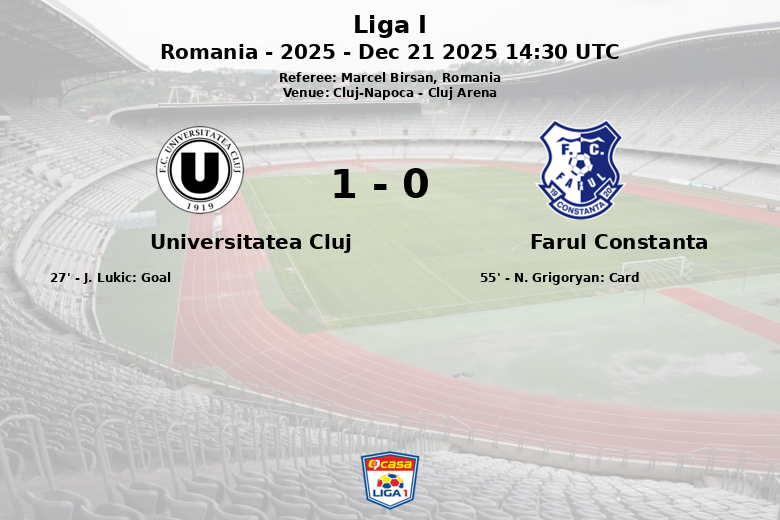 Cluj-Napoca, Romênia – Em uma partida realizada na Cluj Arena, o Universitatea Cluj conseguiu derrotar o Farul Constanta com um placar de 1-0. O único gol do jogo aconteceu aos 27 minutos, cortesia de J. Lukic, que aproveitou uma jogada para enviar a bola para o fundo da rede.