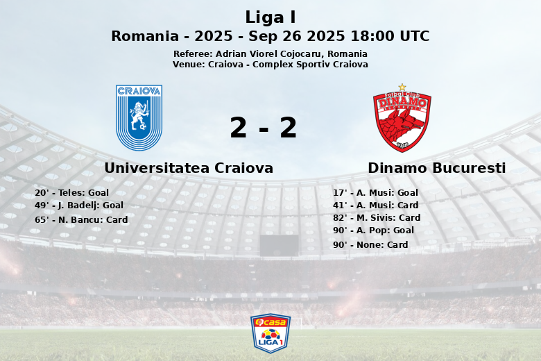 Apesar de jogar com um jogador a menos, o Universitatea Craiova conseguiu manter a vantagem até os minutos finais. Nos acréscimos, o Dinamo Bucuresti encontrou o empate graças a um gol de A. Pop aos 90 minutos, sem assistência específica, selando o placar final de 2 a 2.