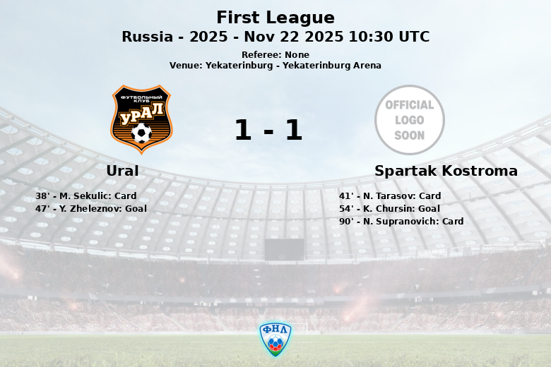 Ecaterimburgo, Rússia – Um jogo disputado entre Ural e Spartak Kostroma na Yekaterinburg Arena terminou em empate, correspondente à 20ª jornada da temporada regular da First League Russa. A partida, jogada em 22 de novembro de 2025, viu ambas as equipes lutarem intensamente pelo controle da bola.