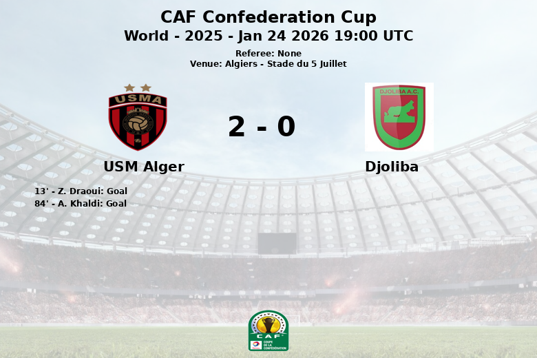 Z. Draoui abriu o placar aos 13 minutos, com assistência de H. Ghacha, dando a vantagem ao USM Alger. O Djoliba, por sua vez, lutou para manter a posse de bola e criar oportunidades, mas só conseguiu acertar um chute no gol em suas quatro tentativas.
