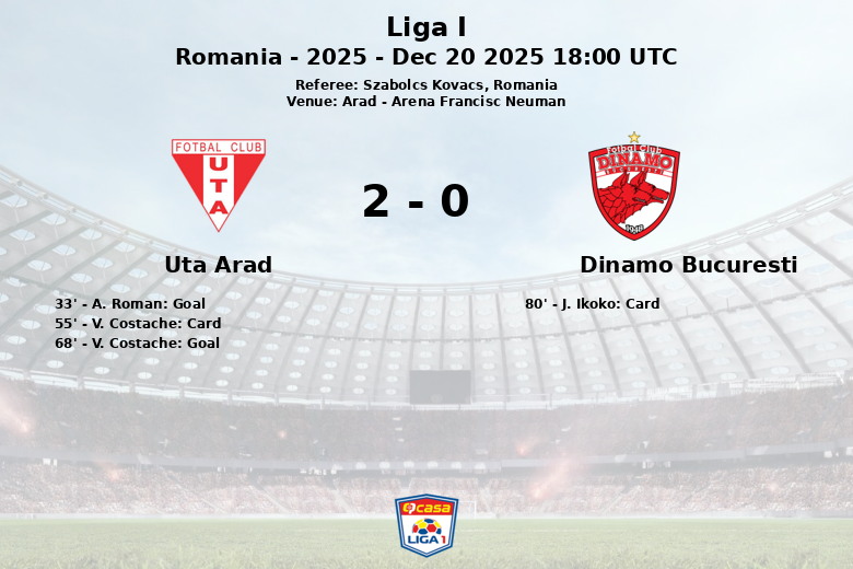 Arad, Romênia – Uta Arad garantiu uma vitória dominante sobre o Dinamo Bucuresti em um jogo realizado na Arena Francisc Neuman, como parte da Liga I. A partida, arbitrada por Szabolcs Kovacs, viu o Uta Arad capitalizar suas chances, apesar de ter apenas 31% da posse de bola.