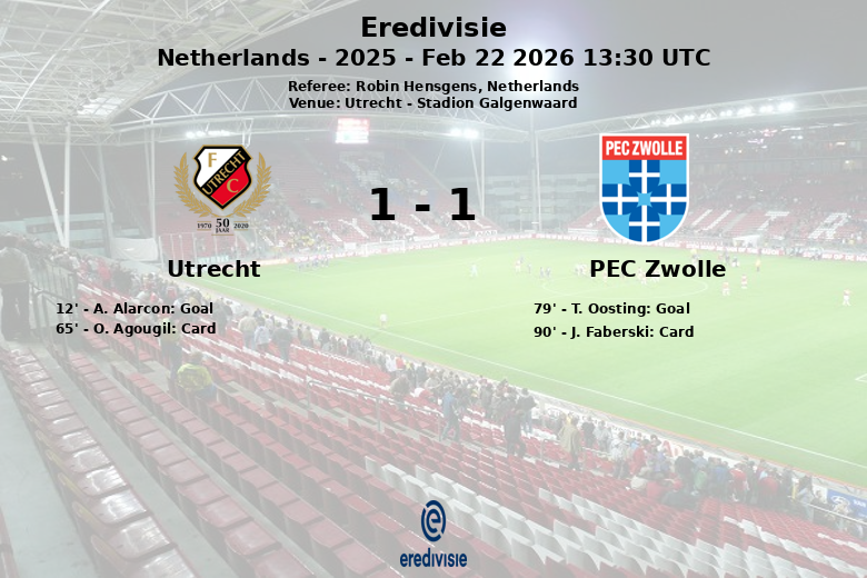 Utrecht e PEC Zwolle empataram em um confronto disputado no Stadion Galgenwaard, pela 24ª rodada da Eredivisie. A equipe da casa, dominando a posse de bola com 53%, abriu o placar aos 12 minutos com um gol de A. Alarcon, assistência de D. de Wit. O Utrecht gerou um total de 22 chutes, embora apenas 3 tenham acertado o alvo.