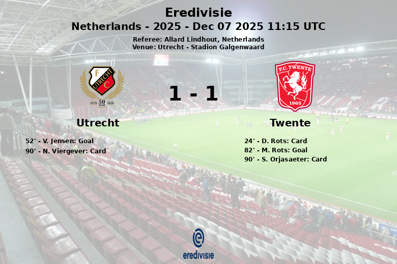 Utrecht, Países Baixos – Em um encontro disputado no Stadion Galgenwaard, o FC Utrecht e o FC Twente empataram em uma partida correspondente à 15ª rodada da Eredivisie. O encontro, arbitrado por Allard Lindhout, foi tenso e com oportunidades para ambas as equipes.