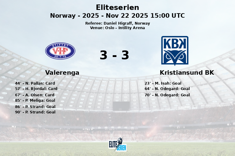 Oslo, Noruega – Em um jogo emocionante realizado na Intility Arena, o Kristiansund BK garantiu uma vitória contra o Valerenga com um placar de 3 a 3. A equipe visitante dominou grande parte da partida, mostrando maior eficácia no ataque. M. Isah abriu o placar para o Kristiansund BK aos 23 minutos, com assistência de M. Rakneberg. N. Odegard ampliou a vantagem aos 64 minutos e novamente aos 70 minutos, com assistência de D. Tufekcic.