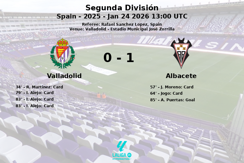 O gol da vitória surgiu aos 85 minutos, cortesia de A. Puertas, que aproveitou uma assistência de Lorenzo para vencer o goleiro da casa. Apesar de estar com menos um jogador, o Valladolid procurou o empate, mas a defesa do Albacete manteve-se firme. O Albacete também dominou nos cantos com 9, contra 5 do Valladolid. A partida terminou com a vitória dos visitantes, deixando o Valladolid com um gosto amargo e o Albacete com três pontos valiosos na sua luta pela qualificação.
