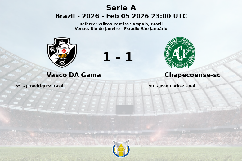 Rio de Janeiro, Brasil – Em uma partida disputada no Estádio São Januário, Vasco da Gama e Chapecoense-SC empataram em 1 a 1. O Vasco da Gama impôs seu jogo com uma posse de bola dominante de 67% e um ataque constante que gerou 30 chutes, dos quais 13 foram ao gol. A pressão constante rendeu frutos aos 55 minutos, quando J. Rodriguez, com assistência de Andres Gomez, abriu o placar para a equipe da casa.