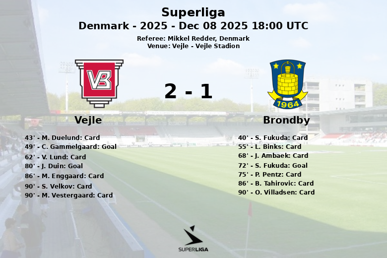 Vejle e Brondby protagonizaram um jogo vibrante e repleto de incidentes no Vejle Stadion, que terminou empatado. O Vejle, jogando em casa, abriu o placar aos 49 minutos com um gol de C. Gammelgaard, assistido por M. Duelund. O Brondby, com maior posse de bola (62%), lutou para igualar o marcador, conseguindo-o aos 72 minutos com um gol de S. Fukuda, após assistência de M. Gregoritsch.