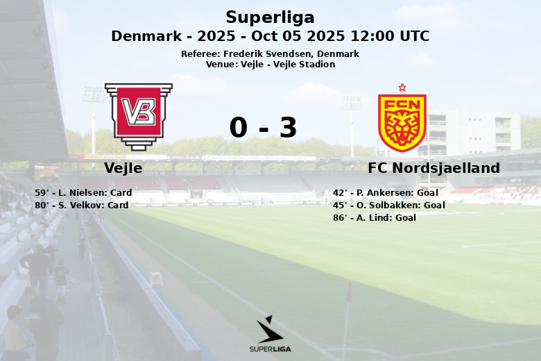 O FC Nordsjaelland selou a vitória aos 86 minutos com um gol de A. Lind, sem assistência. Com este resultado, o FC Nordsjaelland soma três valiosos pontos na Superliga Dinamarquesa. O Vejle, apesar de ter mais escanteios (5 contra 4), não conseguiu concretizar suas oportunidades.