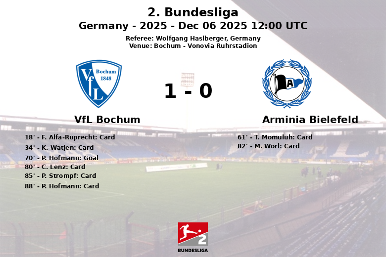 Bochum, Alemanha – Num jogo disputado no Vonovia Ruhrstadion, o VfL Bochum garantiu uma vitória apertada contra o Arminia Bielefeld na 15ª jornada da 2. Bundesliga. O jogo, arbitrado por Wolfgang Haslberger, foi caracterizado por um jogo físico e tático, refletido nos numerosos cartões amarelos mostrados pelo árbitro.