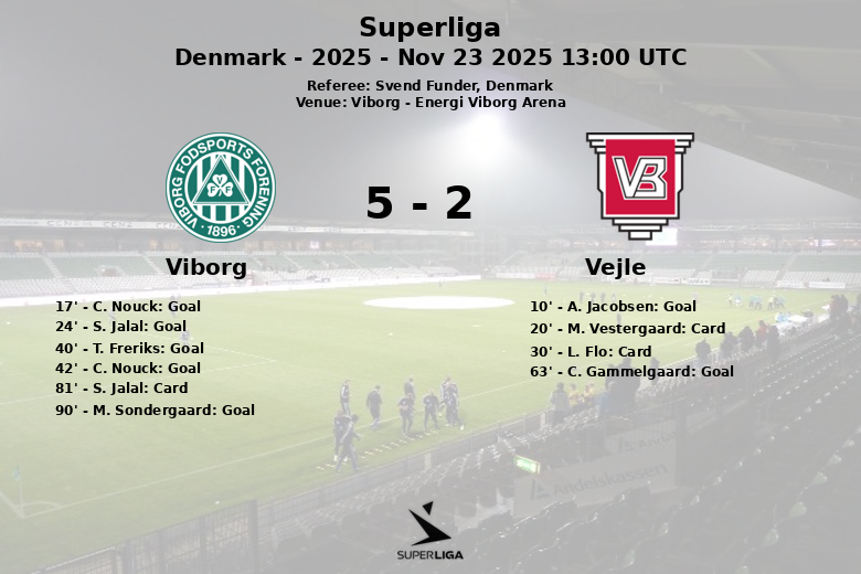 O Viborg continuou sua investida com um gol de pênalti de T. Freriks aos 40 minutos, seguido rapidamente por outro gol de C. Nouck aos 42 minutos. No segundo tempo, o Vejle tentou reagir e C. Gammelgaard descontou aos 63 minutos, mas o Viborg manteve o controle da partida.
