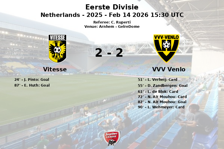 Arnhem, Holanda – Uma partida vibrante no GelreDome viu Vitesse e VVV Venlo empatarem em um encontro cheio de ação e momentos marcantes. A partida, correspondente à rodada 27 da Eerste Divisie, Temporada 2025, deixou os torcedores à beira de seus assentos.