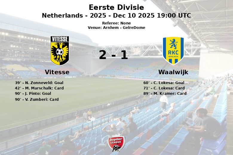 O Vitesse abriu o placar aos 39 minutos com um gol de N. Zonneveld, assistido por A. Tahaui. No entanto, a alegria dos donos da casa durou pouco, pois C. Lokesa empatou para o Waalwijk aos 60 minutos, com assistência de H. Kuster. A partida foi marcada pela intensidade e disputas no meio-campo, refletidas nas inúmeras faltas cometidas por ambas as equipes (15 do Vitesse e 17 do Waalwijk) e nos três cartões amarelos mostrados (um para o Vitesse e dois para o Waalwijk). Quando tudo parecia indicar que o Waalwijk levaria a vitória, J. Pinto marcou para o Vitesse aos 90 minutos, garantindo um ponto valioso para a equipe da casa com assistência de Y. Ranon. O jogo terminou com uma divisão de pontos.