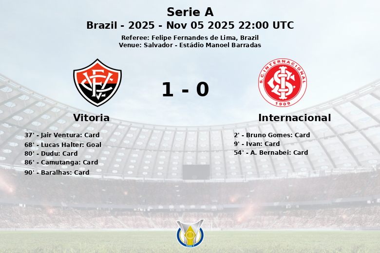 Num jogo vibrante disputado no Estádio Manoel Barradas, em Salvador, o Vitória garantiu uma vitória por 1 a 0 sobre o Internacional. A partida, correspondente à 32ª rodada da Série A brasileira, foi marcada por intensidade e disputas no meio-campo.
