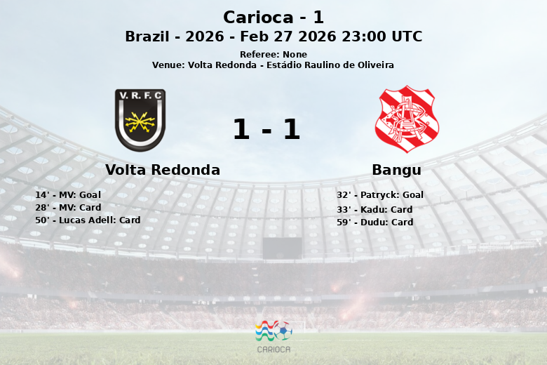 O Volta Redonda abriu o placar logo aos 14 minutos com um gol de MV, após assistência de Bruno Barra, mostrando uma clara intenção ofensiva desde o início. No entanto, o Bangu respondeu com firmeza, igualando o marcador aos 32 minutos graças a Patryck, que aproveitou uma assistência de Luizinho.