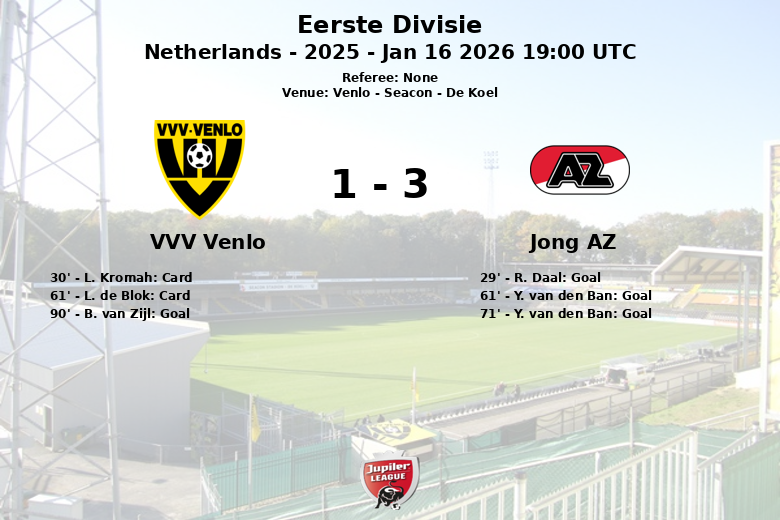 O Jong AZ abriu o placar aos 29 minutos com um gol de R. Daal, assistido por R. Robbemond. No entanto, o VVV Venlo, apesar de mostrar uma maior vocação ofensiva com 16 chutes totais em comparação com os 13 do seu rival, encontrou a solidez defensiva do Jong AZ. A partida foi interrompida por dois cartões amarelos para o VVV Venlo, mostrados para L. Kromah e L. de Blok.