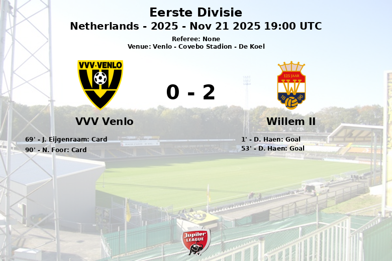 D. Haen, com dois gols (minutos 1 e 53), foi o destaque da partida, ambos os gols com assistência de N. Doodeman. O VVV Venlo tentou reagir, gerando 14 chutes (5 no alvo), mas a defesa do Willem II se mostrou sólida. A partida também foi marcada por dois cartões amarelos para o VVV Venlo, mostrados para J. Eijgenraam e N. Foor. O Willem II, com 41% de posse de bola, foi letal no contra-ataque e levou os três pontos de Venlo.