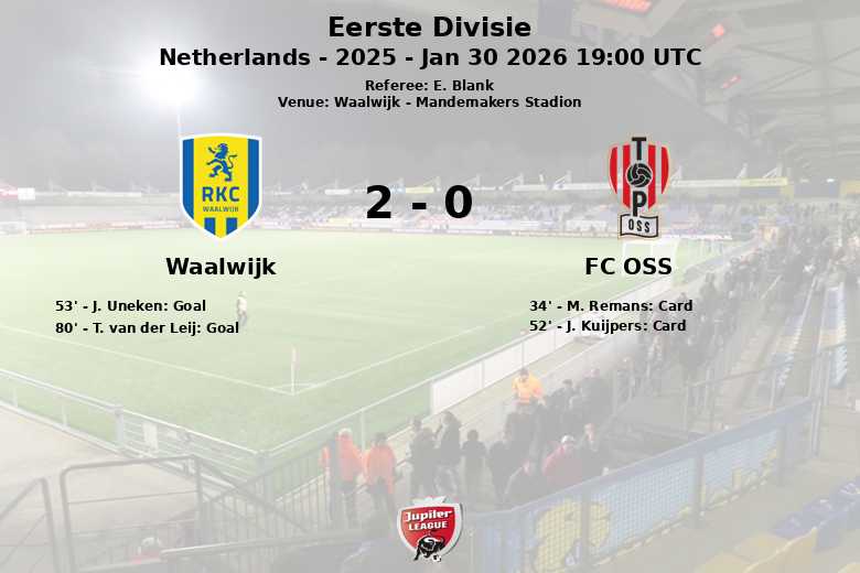 Waalwijk, Países Baixos – Em uma partida realizada no Mandemakers Stadion, o Waalwijk garantiu uma vitória sobre o FC OSS na 25ª rodada da Eerste Divisie. O jogo, arbitrado por E. Blank, viu o Waalwijk dominar a posse de bola com 59% em comparação com os 41% do FC OSS.