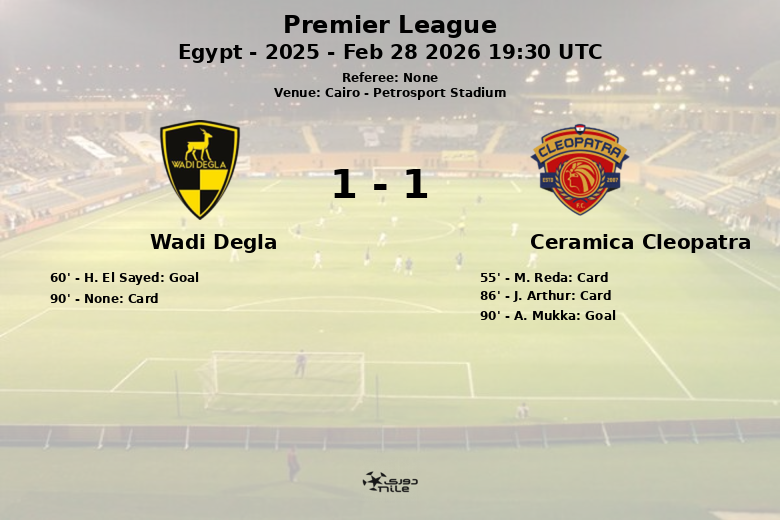 Cairo, Egito – Em um jogo disputado no Estádio Petrosport, o Ceramica Cleopatra venceu o Wadi Degla em partida correspondente à 20ª rodada da Premier League Egípcia. A equipe da casa, Ceramica Cleopatra, dominou a posse de bola com 58%, enquanto o Wadi Degla se manteve com 42%.