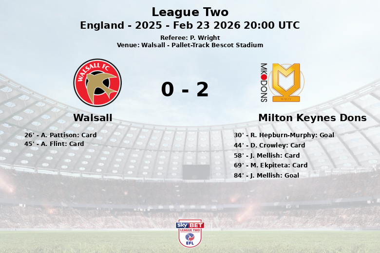 Walsall, Inglaterra – Em partida válida pela 34ª rodada da League Two, o Milton Keynes Dons conseguiu impor-se como visitante contra o Walsall com um placar de 2 a 0. O jogo, disputado no Pallet-Track Bescot Stadium e arbitrado por P. Wright, foi caracterizado por um jogo físico e tático, refletido no alto número de faltas cometidas por ambas as equipes.