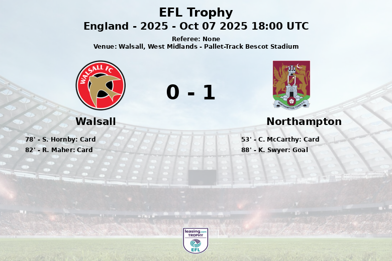 Em um jogo disputado no Pallet-Track Bescot Stadium em Walsall, West Midlands, pela rodada Southern – 2 do EFL Trophy, temporada de 2025, o Northampton Town garantiu uma vitória apertada sobre o Walsall com um gol de K. Swyer aos 88 minutos, com assistência de T. Taylor.