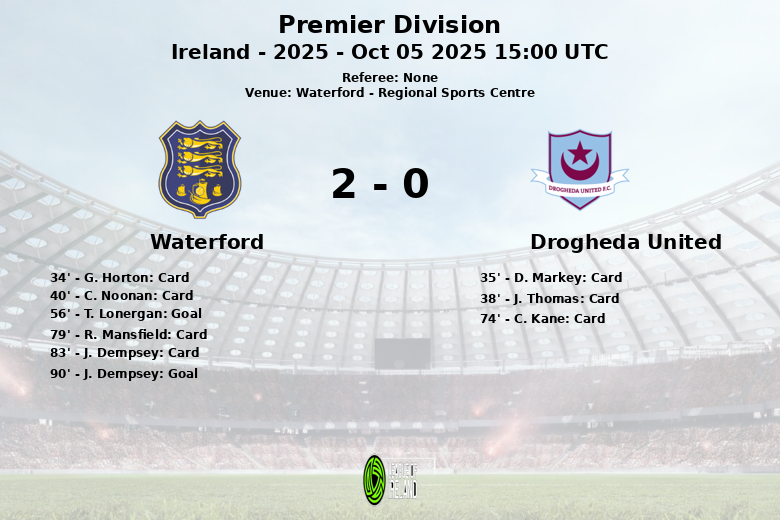 Waterford, Irlanda – Em uma partida tensa e com muitos cartões amarelos, o Waterford derrotou o Drogheda United por 2 a 0 no Regional Sports Centre. A partida, válida pela 33ª rodada da Premier Division irlandesa, foi marcada pela intensidade no meio-campo e constantes interrupções.