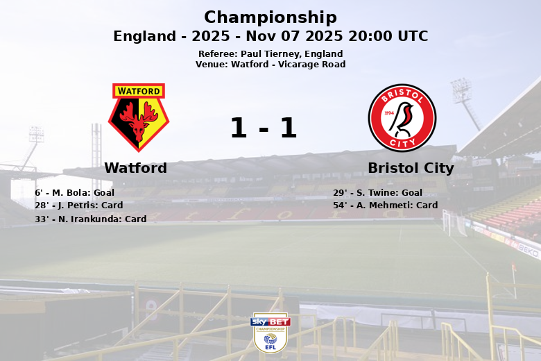 Watford e Bristol City empataram em 1-1 num jogo disputado em Vicarage Road, válido pela 15ª rodada do Championship. O Watford dominou a posse de bola com 64%, buscando constantemente o gol adversário. M. Bola abriu o placar para os donos da casa aos 6 minutos, após assistência de I. Louza, gerando euforia nas arquibancadas. No entanto, o Bristol City não se intimidou e S. Twine empatou aos 29 minutos, silenciando momentaneamente o estádio.