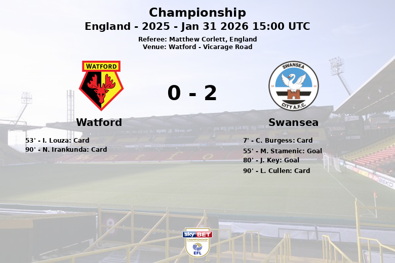 Watford, Inglaterra – Em uma partida disputada no Vicarage Road, o Swansea superou o Watford com um placar de 2 a 0, em um jogo correspondente à 30ª rodada do Championship. Apesar do domínio territorial do Watford, que deteve 57% da posse de bola e gerou 17 chutes (5 no alvo e 7 fora), o Swansea foi mais eficaz na finalização.