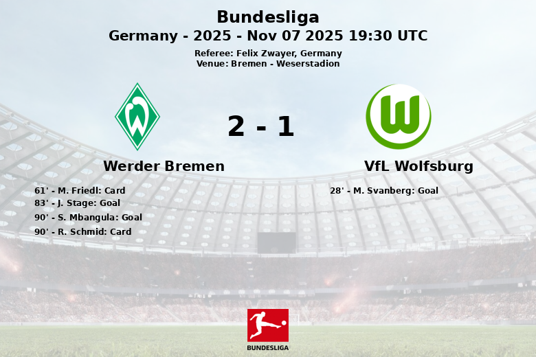 No entanto, o Werder Bremen nunca desistiu. J. Stage empatou o marcador aos 83 minutos, com uma assistência de Y. Sugawara, gerando euforia nas arquibancadas. Quando parecia que o jogo terminaria empatado, S. Mbangula selou a vitória para o Bremen aos 90 minutos, com uma assistência de V. Boniface. Um resultado final que coloca fogo na tabela de classificação da Bundesliga.