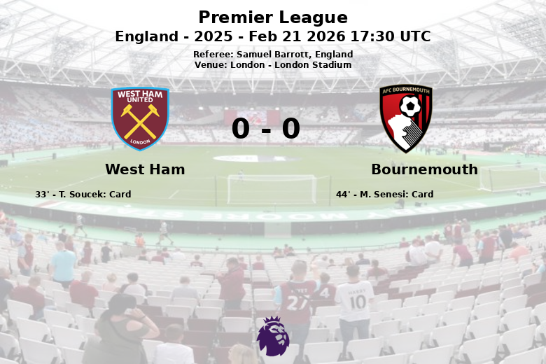 Londres, 21 de fevereiro de 2026 – O London Stadium foi palco de um jogo disputado entre West Ham e Bournemouth que terminou empatado em 0 a 0. Apesar da intensidade no meio-campo, refletida nos cartões amarelos mostrados a T. Soucek do West Ham e M. Senesi do Bournemouth, nenhuma das equipes conseguiu quebrar o bloqueio defensivo da outra.