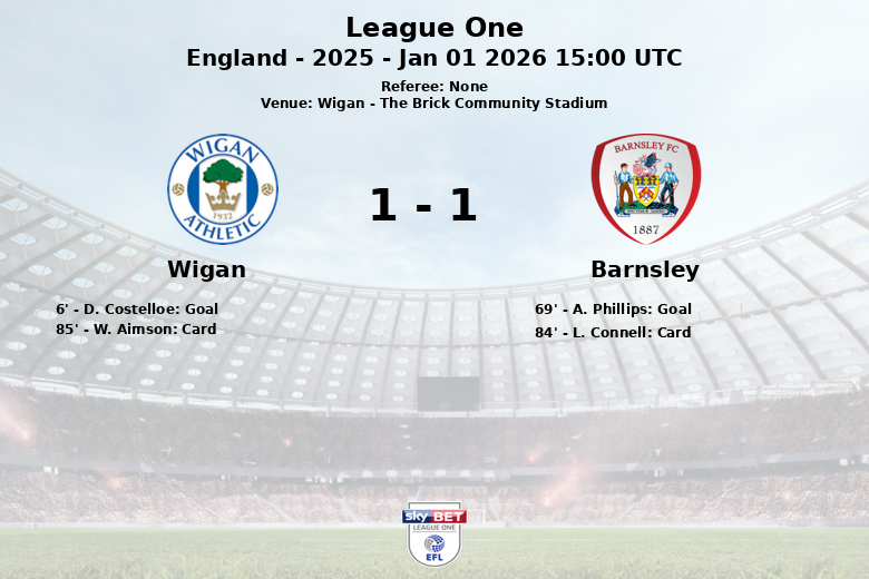 O Wigan Athletic abriu o placar logo aos 6 minutos com um gol de D. Costelloe, assistido por C. Wright. Esse gol inicial deu impulso à equipe da casa, que buscou ampliar a vantagem. No entanto, o Barnsley não se intimidou e, após o intervalo, encontrou o empate aos 69 minutos com um gol de A. Phillips, assistido por D. McGoldrick.