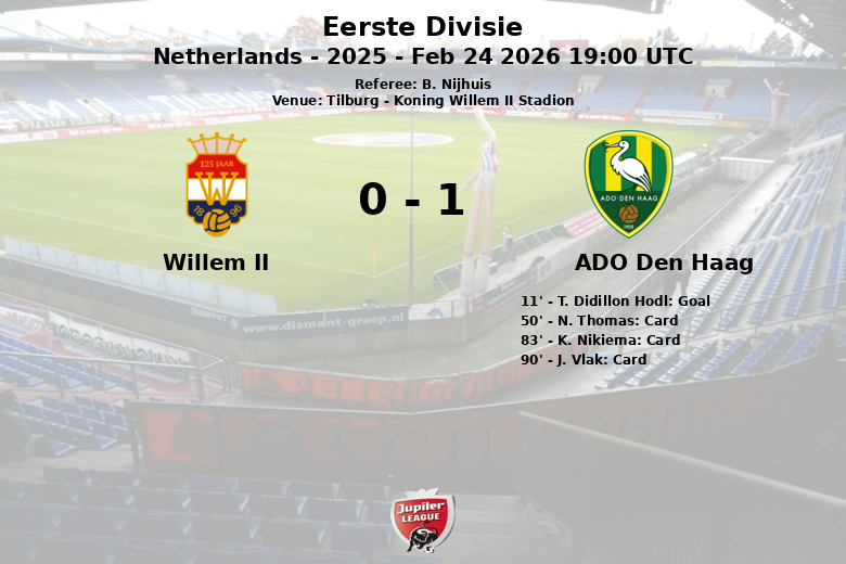 Substituiões na equipe de willem ii: Aos 56 minutos, A. Culum entrou e S. Bamba saiu., Aos 56 minutos, A. Zarrouk entrou e G. Besselink saiu., Aos 56 minutos, T. Verheydt entrou e S. Baartmans saiu., Aos 77 minutos, N. Doodeman entrou e L. Abildgaard saiu., Aos 88 minutos, N. Tjoe a On entrou e P. van Loon saiu.