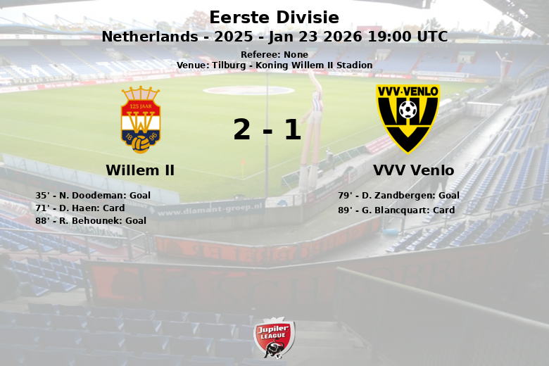 Tilburg, Países Baixos – Em uma partida disputada no Koning Willem II Stadion, o Willem II venceu o VVV Venlo com o placar final de 2 a 1 em um jogo correspondente à 24ª rodada da Eerste Divisie.
