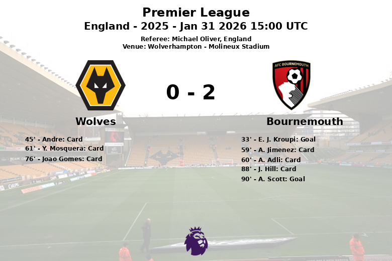 O Bournemouth abriu o placar aos 33 minutos com um gol de E. J. Kroupi, assistido por A. Adli. Os Wolves, com um total de 16 chutes, tentaram igualar o placar, mas a defesa do Bournemouth se manteve firme. O primeiro tempo terminou com um cartão amarelo para Andre dos Wolves.