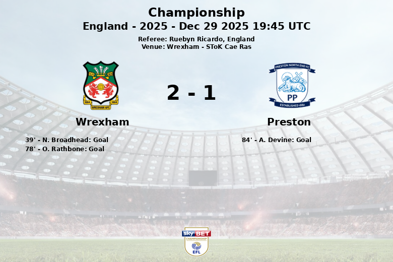 Wrexham, Inglaterra – Em um jogo emocionante disputado no SToK Cae Ras, o Wrexham derrotou o Preston por um placar de 2 a 1. A partida, correspondente à 24ª rodada do Championship, foi caracterizada por um ritmo intenso e oportunidades para ambas as equipes.