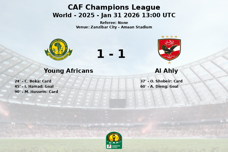Zanzibar City testemunhou um encontro disputado entre o Young Africans e o Al Ahly, culminando em um empate de 1-1 no Amaan Stadium. A partida, correspondente à quarta rodada da fase de grupos da Liga dos Campeões da CAF, foi caracterizada pela intensidade e disputa no meio-campo.