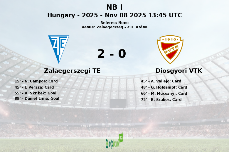 Zalaegerszeg, Hungria – Em uma partida disputada no ZTE Aréna em 8 de novembro de 2025, o Zalaegerszegi TE garantiu uma vitória contra o Diosgyori VTK com um placar de 2 a 0. O jogo, parte da rodada 13 da temporada regular da NB I, foi caracterizado por intensidade e advertências.
