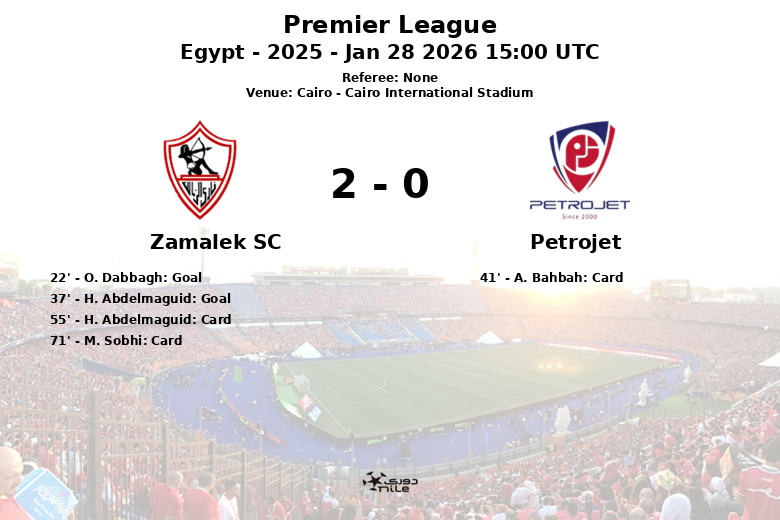 O Zamalek SC venceu o Petrojet no Estádio Internacional do Cairo, em partida válida pela 16ª rodada da Premier League egípcia. A equipe branca controlou o jogo com 55% de posse de bola e, embora o Petrojet tenha tentado surpreender com 18 chutes, a eficácia do Zamalek foi determinante.