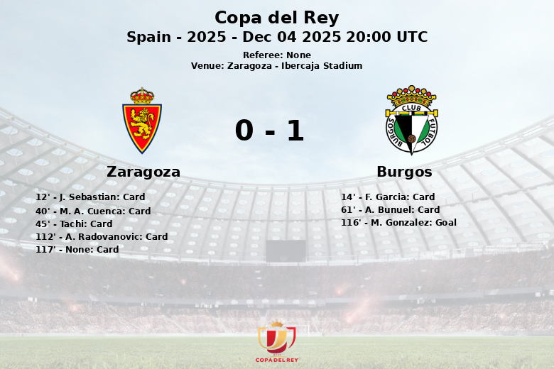Zaragoza, Espanha – Um jogo tenso e repleto de cartões amarelos no Estádio Ibercaja terminou com a vitória do Burgos na prorrogação, em partida válida pela Copa del Rey. O único gol do jogo surgiu aos 116 minutos, marcado por M. Gonzalez, com assistência de M. Cantero, gerando euforia entre os torcedores do Burgos.