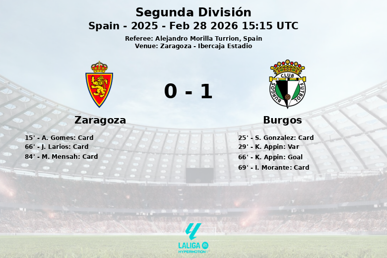 Saragoça, Espanha – O Burgos Club de Fútbol derrotou o Real Zaragoza em um jogo acirrado disputado no Ibercaja Estadio. Apesar de ter menos posse de bola (54% para o Burgos contra 46% para o Zaragoza), a equipe visitante conseguiu aproveitar suas oportunidades para levar todos os três pontos.