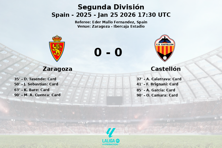A partida foi caracterizada por um alto número de faltas, 12 cometidas pelo Castellón e 8 pelo Saragoça, refletindo a intensidade na disputa pela bola. O árbitro, Eder Mallo Fernandez, mostrou um total de sete cartões amarelos, três para jogadores do Saragoça (D. Tasende, J. Sebastian e K. Bare) e quatro para jogadores do Castellón (A. Calatrava, F. Brignani, A. Garcia e O. Camara). A tensão culminou com a expulsão de M. A. Cuenca do Saragoça aos 90 minutos.