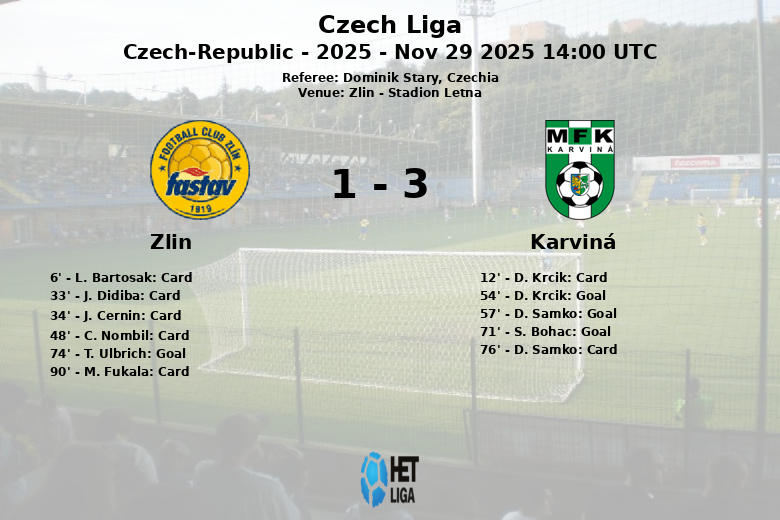 Zlin, República Tcheca – Karviná derrotou o Zlin no Stadion Letna em uma partida disputada e marcada por numerosas advertências. O jogo, correspondente à 17ª rodada da Czech Liga, terminou com uma vitória do Karviná com três gols contra um da equipe local.